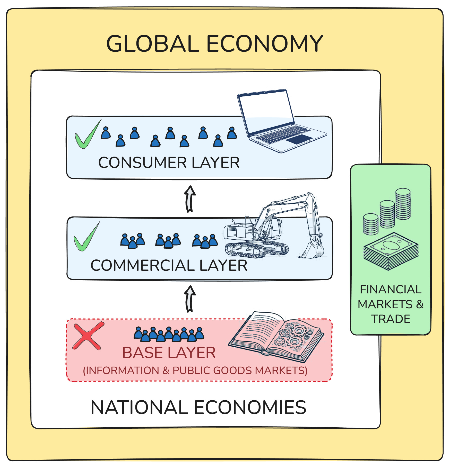 The purpose of the Base Layer is to provide the basic infrastructure and knowledge that makes markets possible in the first place, and to ensure even-handed treatment of all economic actors. As this layer is meant to serve the economy as a whole, it is commonly operated by government. This is where the rules of the game are written — and where things start to go wrong.